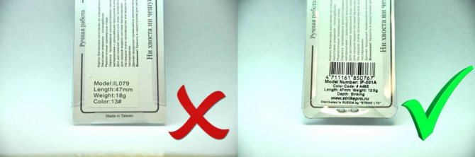 На упаковке оригинала в обязательном порядке размещается: штрих-код, название модели, характеристики, информация о дистрибьюторе, ссылка на официальный сайт. На упаковке подделки есть только информация о характеристиках балансира (модель, длина, вес, цвет). При этом маркировка модели у настоящих балансиров Strike Pro должна начинаться символами D-IF (что обозначает наличие капли на подвесном тройнике), либо IF (без капли на подвесном тройнике). У подделки маркировка может начинаться на любую букву английского алфавита.