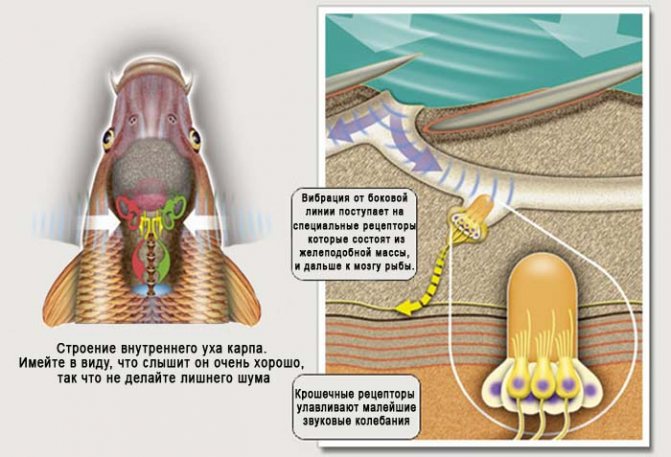 Сами рыбы слышат отлично, потому что плотность воды в несколько раз выше плотности воздуха, и колебания там распространяются намного сильнее и быстрее. У рыб нет внешнего уха, но есть внутреннее, расположенное в задней части черепа. Звуковые колебания они улавливают боковой линией и дополнительно – плавательным пузырем, который работает как резонатор и усиливает вибрацию. Но его используют в качестве усилителя не все рыбы, поэтому у одних слух лучше, а у других хуже. К примеру карпы и плотва, слышат лучше, чем хищники, окунь и щука, которые больше полагаются на зрение.