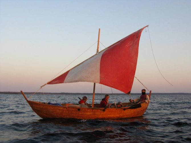 Красавица «Йолма» — пять пар весел, прямой парус из белого хлопкового тика, пропитанного льняным маслом, шкоты и брасы, ванты и штаги, удерживающие шестиметровую мачту, сделанные из натуральных веревок и также пропитанные льняным маслом, чтобы меньше мокнуть.