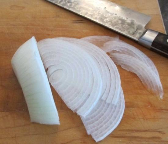 - Лук чистят, моют, нарезают кольцами.