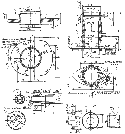 увеличить, 302 КБ 1 — фланец, нержавеющая сталь; 2 — стакан ведущей шестерни, нержавеющая сталь; 3 — муфта, сталь 45 калить HRC=45-50; 4 — обойма манжеты, сталь нержавеющая, латунь; 5 — кольцо стопорное, латунь.
