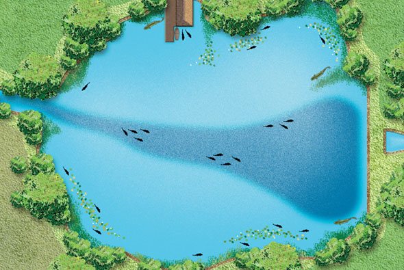 Оказавшись на незнакомом водоеме, приходится искать перспективное место для рыбалки, а это совсем не просто. Хотя не просто бывает у начинающих рыбаков, а опытные рыбаки смогут быстро определить перспективные места по характеру движения воды в водоеме. Если это пруд и движение воды ограничено порывами ветра, то здесь несколько сложнее. В данном случае вступают в силу совсем другие критерии определения мест сосредоточения рыбы.