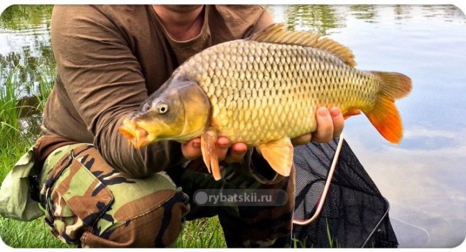 Поймать карпа поплавочной удочкой — большое удовольствие. Важно вытащить карпа быстро, без лишних проволочек, и сразу взять в сачок. Он должен быть в воде с самого начала ловли, если ловят, стоя в воде, то можно просто положить его в воду и оснастить парой пенопластовых поплавков на ручке, чтобы он плавал рядом среди стеблей камыша и не утонул и его можно было бы сразу взять. Долгое вываживание здесь ни к чему — обычно крупный карп чем дольше водится, тем сильнее бьётся, и если успеть вытащить его в сачок сразу, будет меньше риска оборвать снасть.