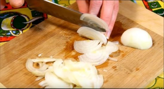 1. Полукольцами или четвертями колец (можно даже мелко кубиками) нарезаем лучок.