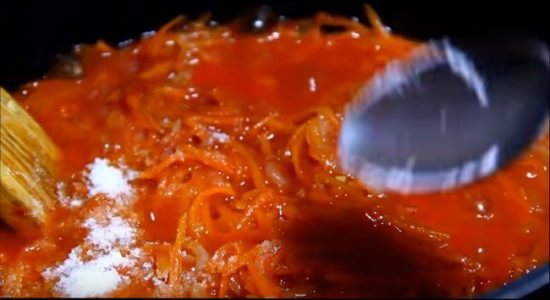 Когда морковка дойдет до состояния готовности, влейте к овощам кипяченую воду, стакан и пропущенные через мясорубку помидоры. Если вы берете вместо свежих помидоров пасту, то самое время добавить ее, но не забудьте немного развести водой.