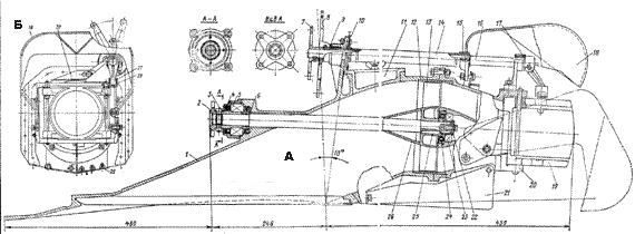 1 — водовод; 2 — фланец гребного вала; 3 — срезной болт; 4 — манжета сальника I-40×60-I; 5 — подшипник № 3056207; 6 — упорная шайба; 7,8 — качалка реверсивного устройства; 9 — втулка-подшипник; 10 — фланец манжеты; 11 — смотровой лючок; 12 — кольцо; 13 — рабочее колесо; 14 — вал реверса; 15 — водило вала реверса; 16 — вал управления створками; 17 — опорный кронштейн с втулкой; 18 — заслонка заднего хода; 19 — поворотная створка; 20 — корпус сопла; 21 — стабилизатор; 22 — прижнмиая шайба; 23 — шарикоподшипник № 206; 24 — корпус с сальником I-80×60-I; 25 — шпонка; 26 — обтекатель ступицы; 27 — водило вала управления; 28 — шарнир; 29 — защитная решетка; 30 — скоба реверса.