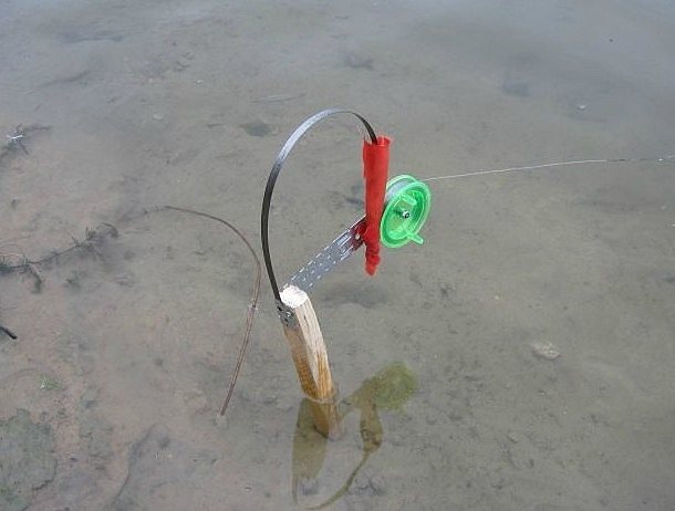 - В прибрежное дно водоема втыкается длинный шест длиной 2-3,5 метра под наклоном 45 градусов, чтобы живец не смог запутать леску вокруг него.