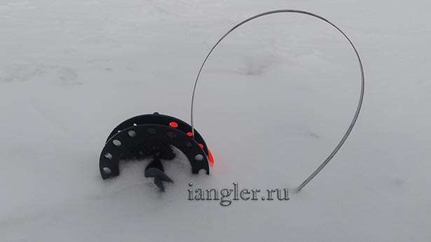 И всё бы хорошо, но давайте представим ситуацию, когда идёт снег и через час все жерлицы заметает снегом. Для обычной жерлицы проблем нет, при поклёвке флажок взлетит в верх, а снег предотвратит замерзание лунки и вмерзание лески, и ни каких проблем.